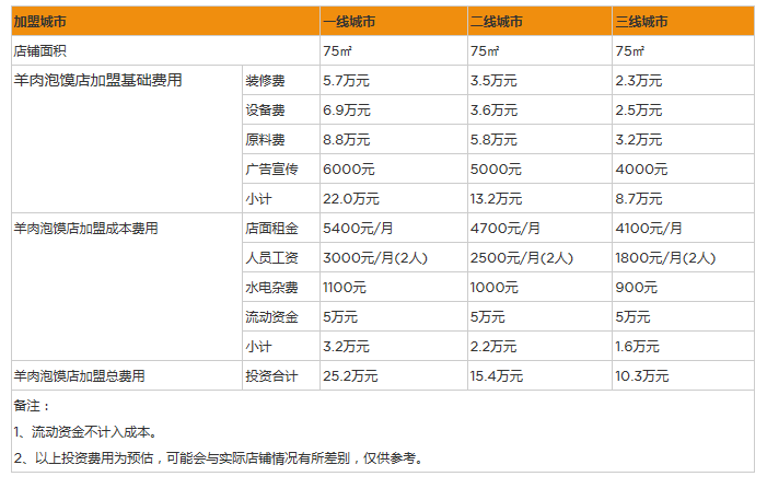 除了交予總部的固定加盟費用,智慧之選開一家羊肉泡饃店,還需承擔基本的門店籌建支出,含房租、裝修、電器、設備、人工等。