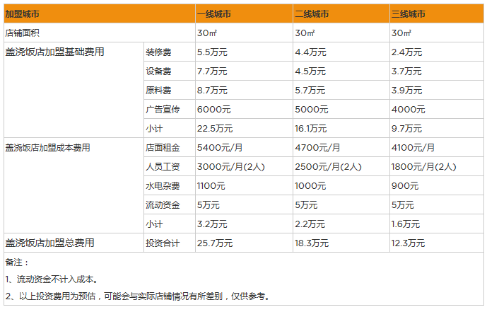 加盟費、在一二線城市開一家30平米的蓋澆飯店,由于沒有蓋澆飯從業經驗,一般只能選擇加盟,現在的蓋澆飯店加盟費、設備費、材料費七七八八的加起來需要最低5萬元左右。