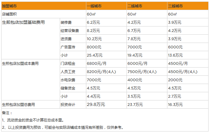 小型店:店鋪面積按照60平米計算,預估按照4500元一個月,店面所需要的原材料費用是2萬元;店面的裝修是300元每平米,60平米的店面整體下來就是1.8萬元;制作生煎包時需要的員工大致是3人,每人按照3千元每月計算,總共就是9千元;流動資金大致是3萬元,在算上開業費1萬萬元、廣告宣傳的費用1萬元,所以中型店預估總投資金額投資需要16.3萬元左右。