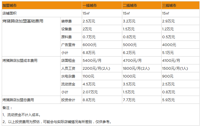 縣級(jí)城市:經(jīng)營(yíng)15㎡的烤豬蹄店需要投入前期原材料5000元、人工成本1500元/月、設(shè)備費(fèi)用1.2萬(wàn)元、流動(dòng)資金1萬(wàn)元等等,開店的總費(fèi)用是5.87萬(wàn)元。