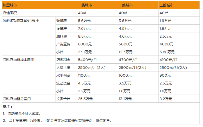 1、加盟費用:涼粉的現在的主要加盟方式是區域代理和單店特許加盟兩種方式,所以根據加盟代理的方式不同,加盟費用一般在5-10萬元不等,而且加盟保證金為2萬元,品牌使用金為2萬元,市場管理費用為0.3萬元每年。