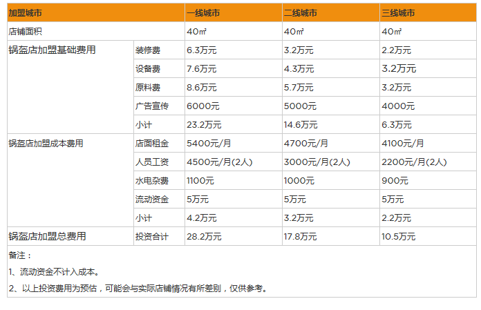 加盟一個鍋盔店,需要承擔兩部分費用,即加盟費和門店建設費用,加盟費是因享受品牌商標使用權,獲得總部服務與支持而需要交納的費用,加盟品牌不同,加盟級別不同,相應的加盟費會有一定的差別,以加盟品牌給出為準。