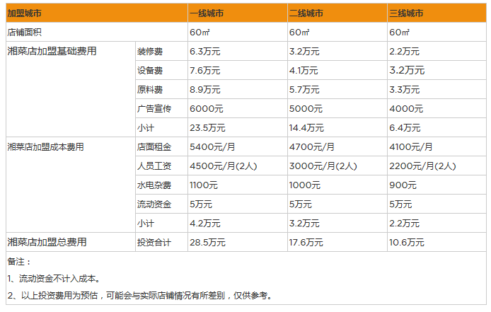 門店費(fèi)用包含了門店租賃費(fèi)、裝修費(fèi)、設(shè)備采購(gòu)安裝調(diào)試費(fèi)用等項(xiàng)目。湘菜店是家常菜館,比快餐店要稍微正式一點(diǎn),所以規(guī)模需求較大,會(huì)達(dá)到個(gè)百余平米的樣子。而像餐館這種,大多開(kāi)在人流量較大的地方,對(duì)地段好壞也有要求。
