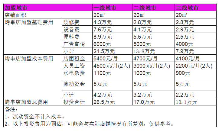 若想要開一家烤串店,那么就必須先擁有一家店面。而我們都知道開烤串店其實并不需要太大的店面,一般面積達到了20平方米就足夠使用了,而根據市場調研價格,每二十平方的所需投資金額為一萬元左右。當然燒烤的設施也不可避免的需要成本,一般一家烤串店需要有烤爐、冰柜、收銀臺,這一類的成本根據市場調查約為三萬元;而人員則一般是需要一個店主、兩到三個服務員,而每一個服務員的工資約為每月三千元。而這些成本加起來就相對比較高,因此流動攤位成為了很多人的選擇。