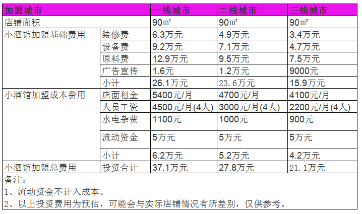 假設(shè)在一家地級(jí)城市開設(shè)一家小酒館的話,需要有充足的酒產(chǎn)品,桌椅板房等擺放空間,加盟商需要準(zhǔn)備一個(gè)90平方米大小的店鋪,按照地級(jí)城市的房?jī)r(jià)計(jì)算,每月需要支付1.67萬元的房租費(fèi)用,酒館的裝修需要符合其經(jīng)營(yíng)理念和營(yíng)造良好的氛圍,門店需要進(jìn)行精致的裝修,大約需要花費(fèi)4.5萬元。