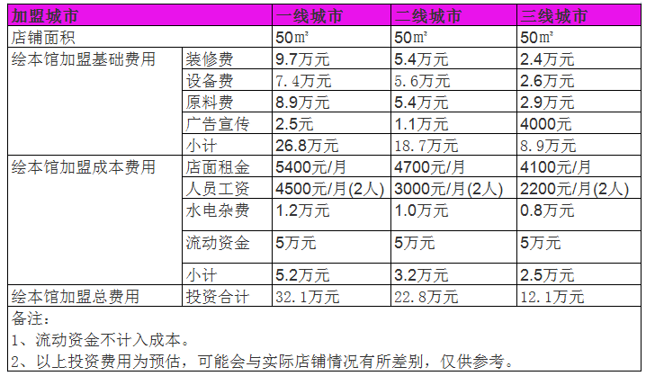 如果投資者們不愿意太過麻煩,或者擔(dān)心自己沒經(jīng)驗(yàn),不怎么懂經(jīng)營的話,也可以選擇合適的店面加盟,對比一個(gè)人開店來說的話,還是要輕松點(diǎn)。如果選擇加盟的話,單店加盟費(fèi)為1-5萬元,綜合的為5-10萬元,復(fù)合館的費(fèi)用大致在15-20萬之間。開一家50平米的繪本店,成本12萬左右。