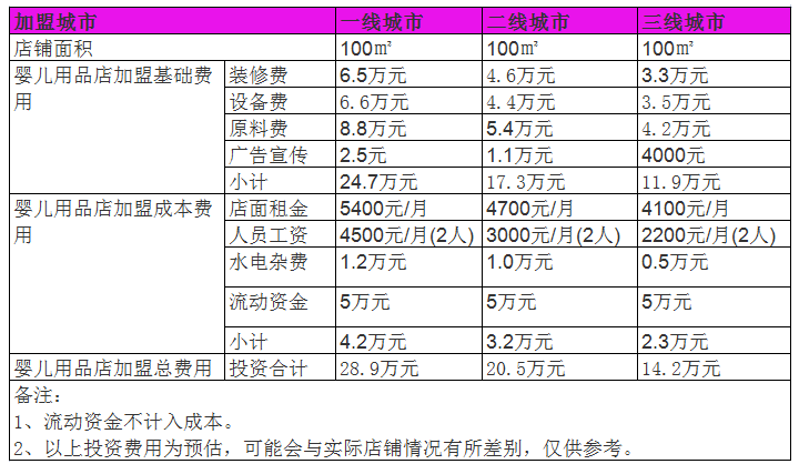 100㎡的嬰兒用品店成本在14萬元左右。開母嬰用品店成本及母嬰店利潤根據(jù)各地域?qū)嶋H情況和店面大小肯定會有所差別,投資者可參考數(shù)據(jù)結(jié)合當(dāng)?shù)厥袌銮闆r進(jìn)行分析。