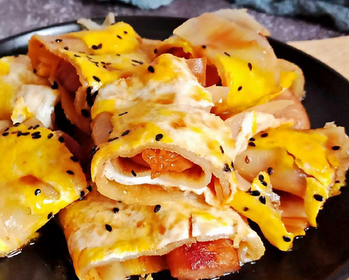 烤冷面是在一塊鐵板上,攤一塊方形的面皮,打一個雞蛋,煎好后用鏟子切開,然后加上火腿腸、凍豆腐等等配菜,最后撒上辣椒面、醬汁等等調味作為結束,不得不說用料還是很豐富的,而且冷面筋道彈牙,味道真的相當不錯。